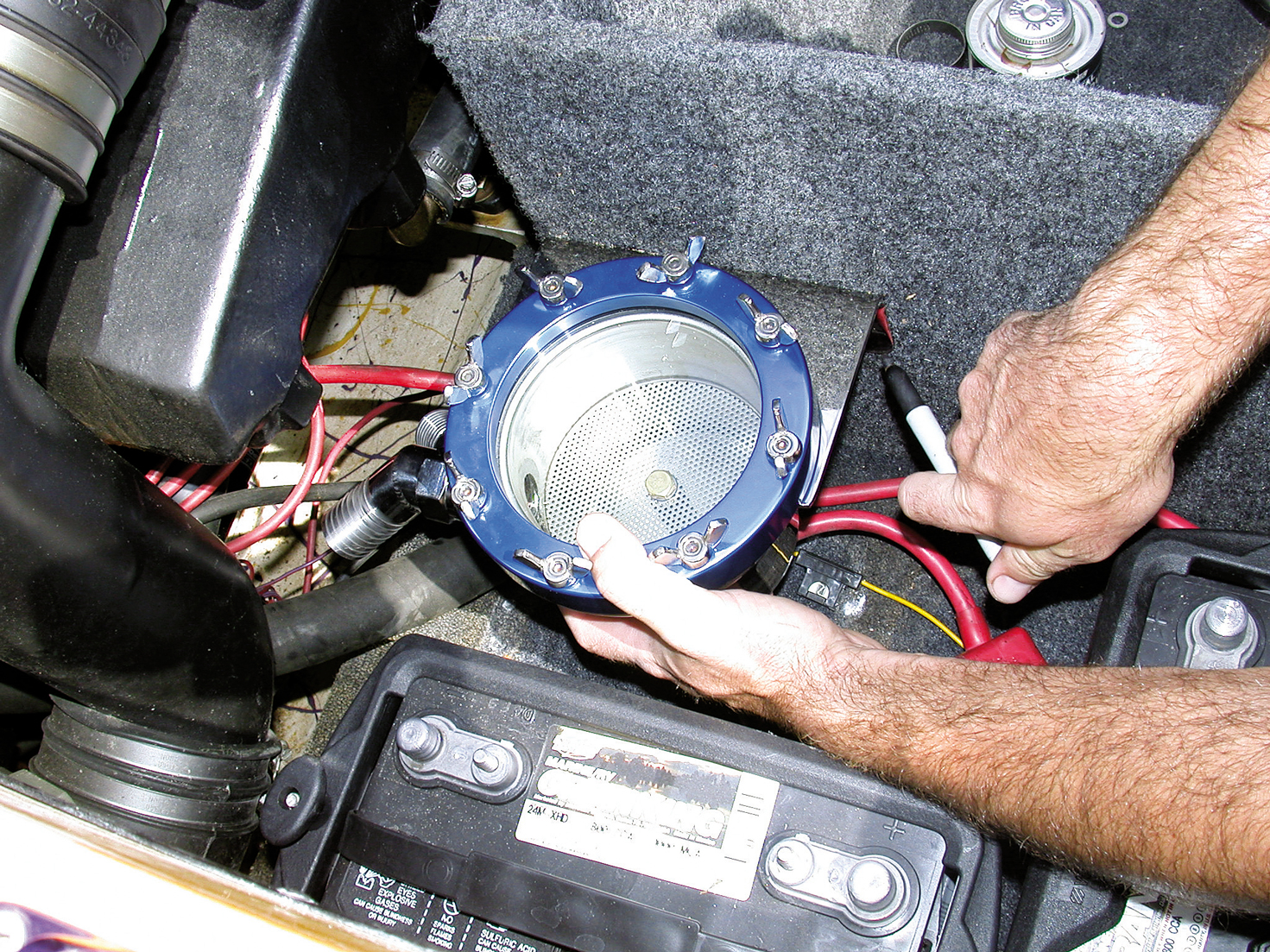 Dan Duffin of Maveric Marine holds the sea strainer in position and marks the mounting point.