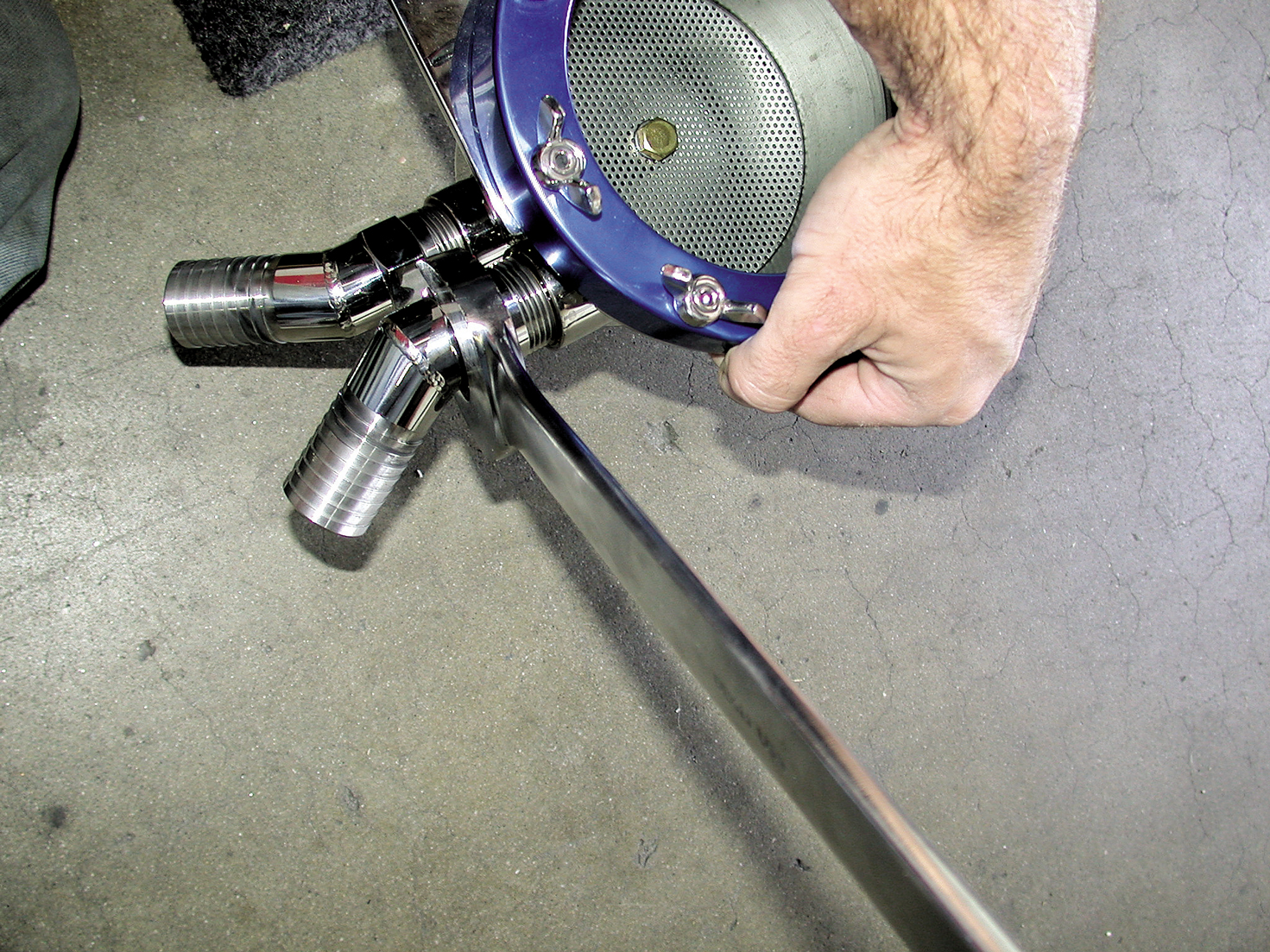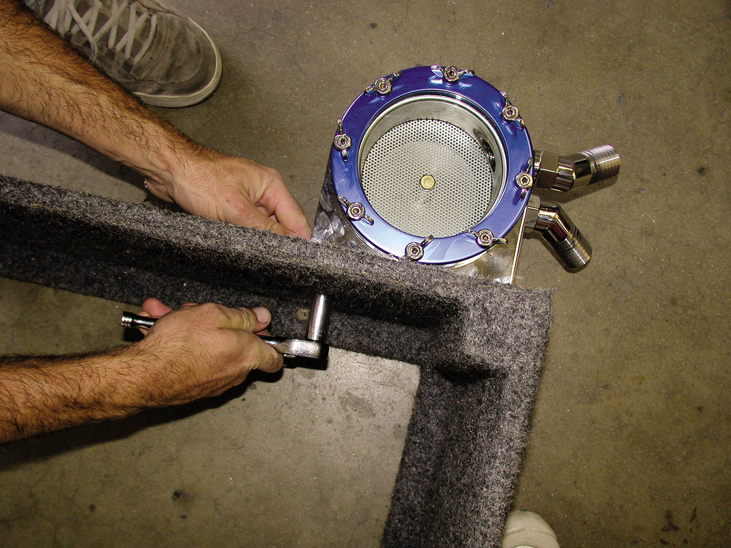 Duffin tightens the bracket that will mount the strainer. There are various mounts available for a variety of situations.