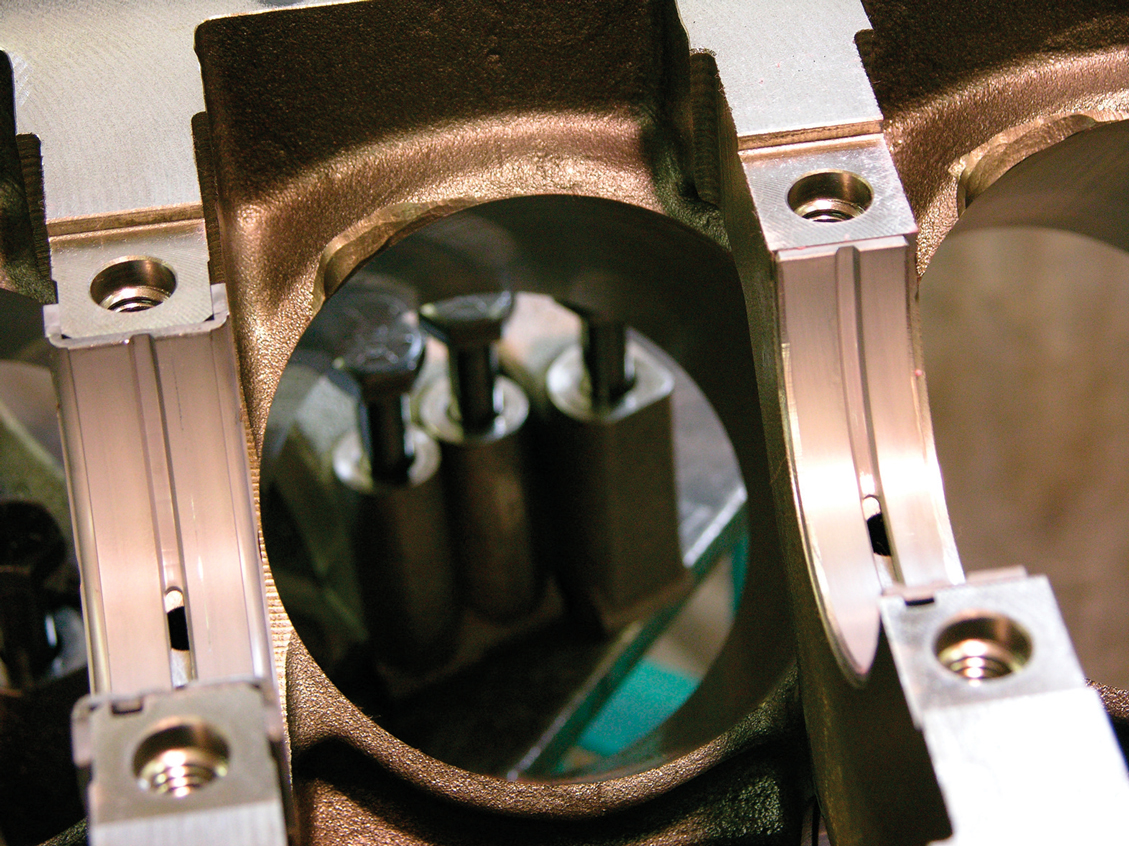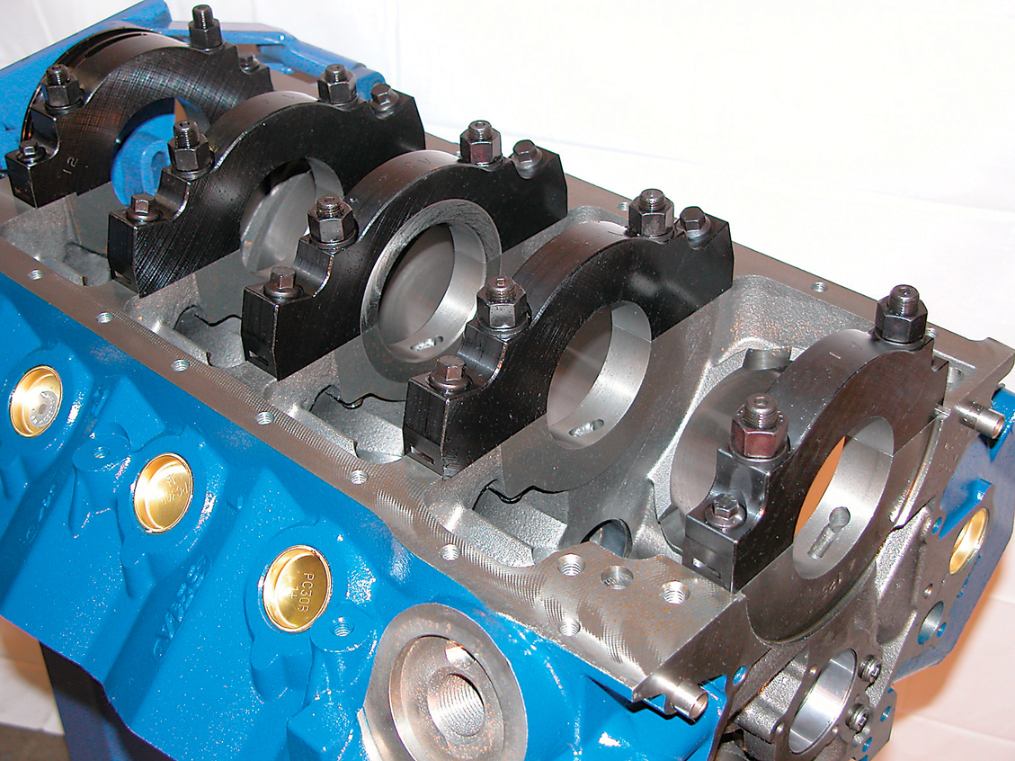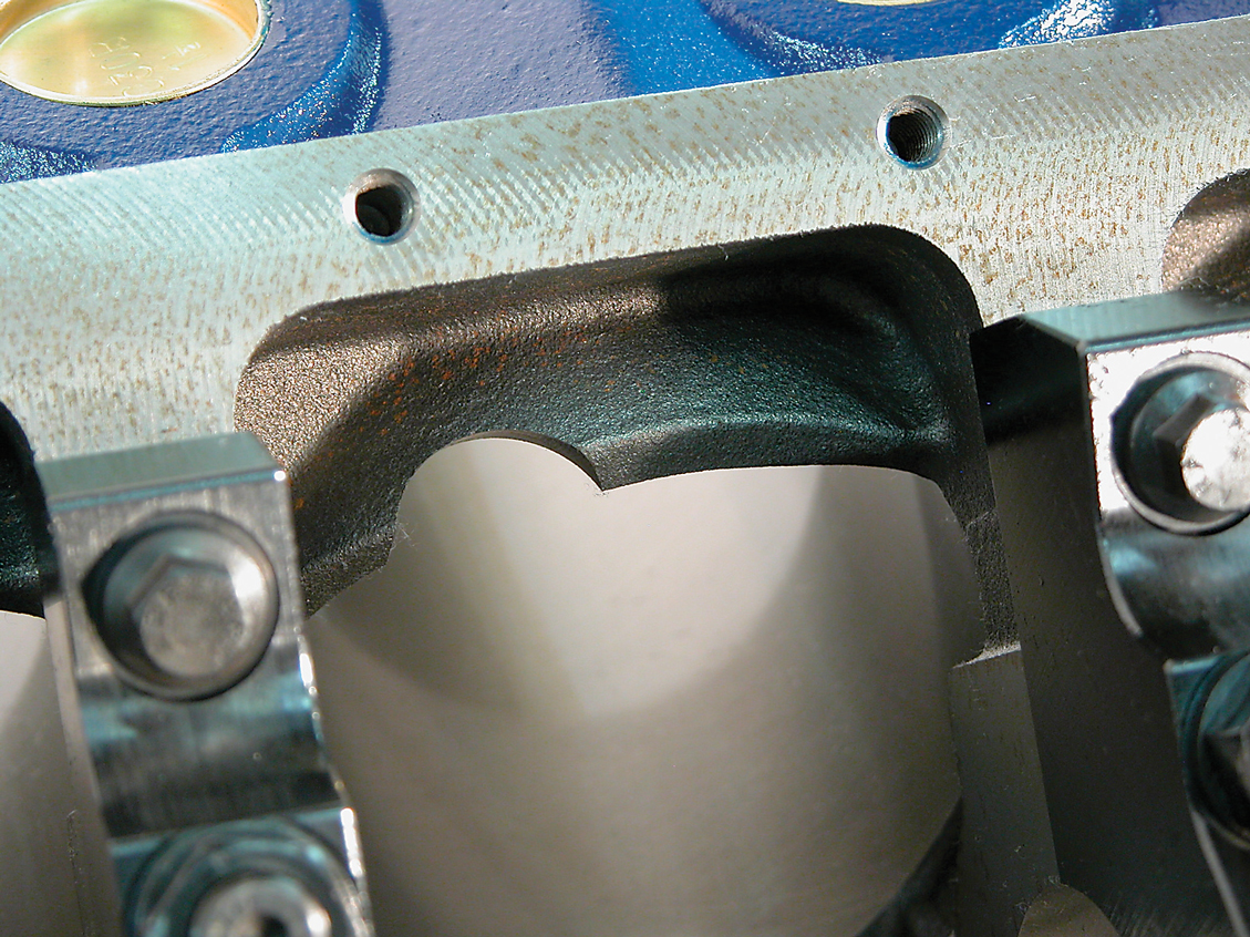 Look at the beef around the cylinder bores. You will not find this kind of stiffness in a stock block. The additional material around the bores will allow the block to be bored a maximum of 4.200-inches, and with a 4.250-inch stroke, it will net a radical 470-inch small block!
