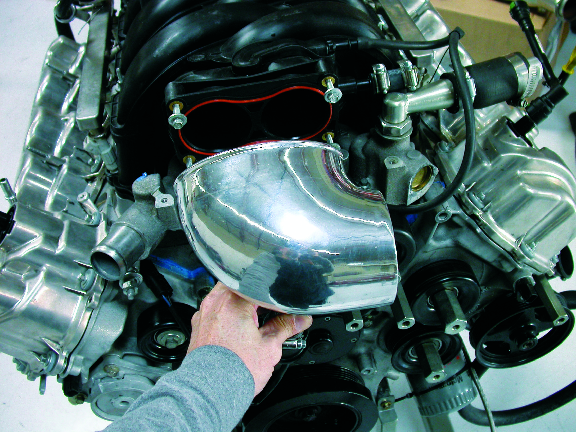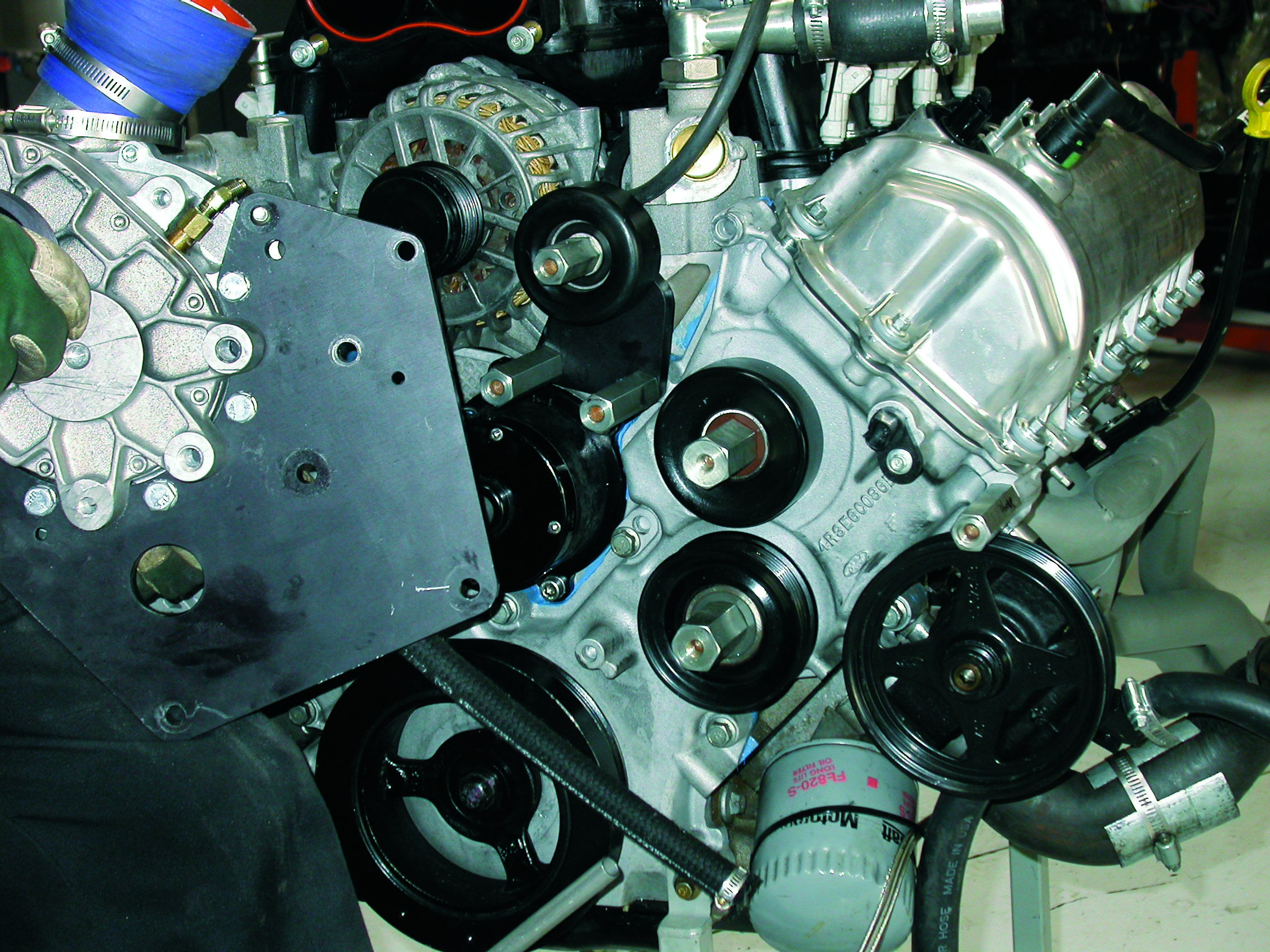 After running the three-valve engine in normally aspirated trim, it was time to install the Vortech S-trim supercharger kit. Installation of the Vortech required replacing the electric water pump with the stock (belt-driven) unit. It was necessary to utilize all of the factory accessories to successfully drive the supercharger using the supplied drive belt. Like previous systems, the remainder of the factory accessories shared the six-rib serpentine drive belt used for the blower, greatly improving packaging. The Vortech S-trim supercharger was mounted to the driverʼs-side front cover using a dedicated mounting plate and a series of stand-offs. Also included in the Vortech kit was a short discharge tube. This standard kit did not include one of the Vortech air-to-water aftercoolers, although we will be testing that system in the near future. Of course, the lack of intercooling did not stop us from upping the boost pressure with a pulley change (read on). The Vortech kit was supplied with a 3.60-inch blower pulley, and when combined with the factory 6.5-inch crank pulley, it produced a drive ratio of 1.805:1. The drive ratio combined with the internal step ratio in the blower determined the impeller speed (and attending boost level) at the various engine speeds.