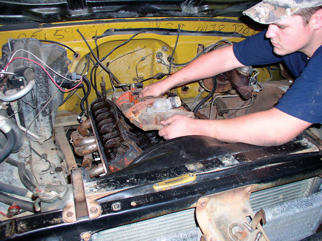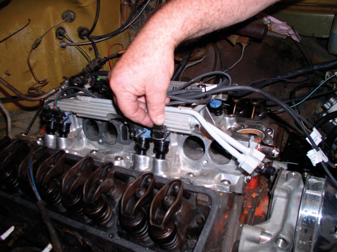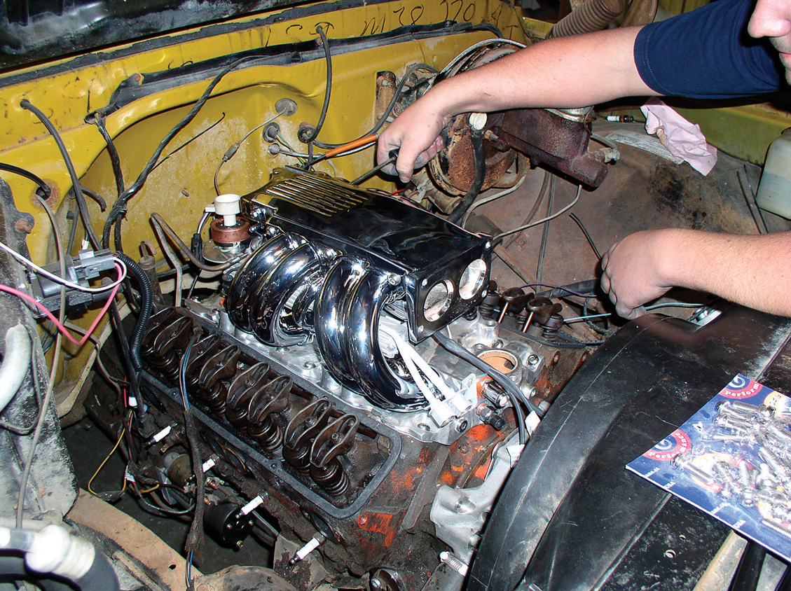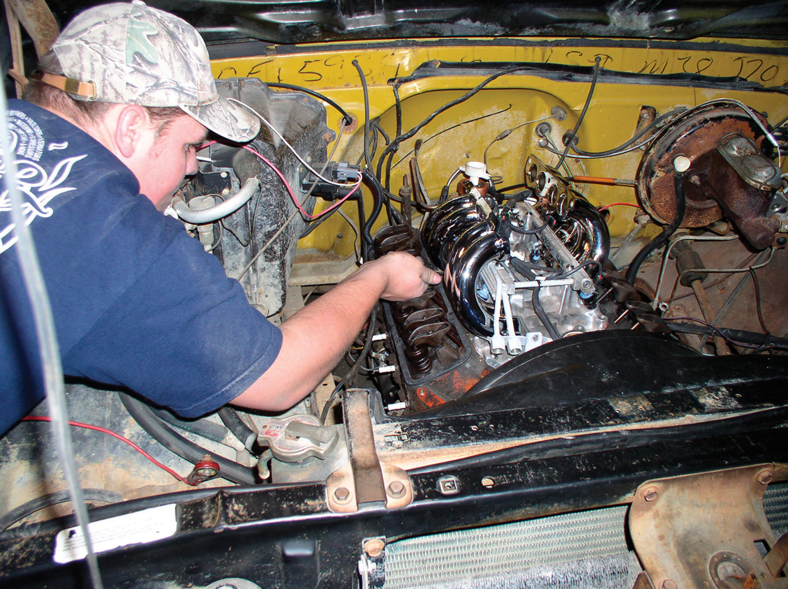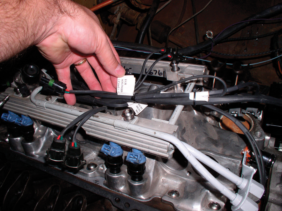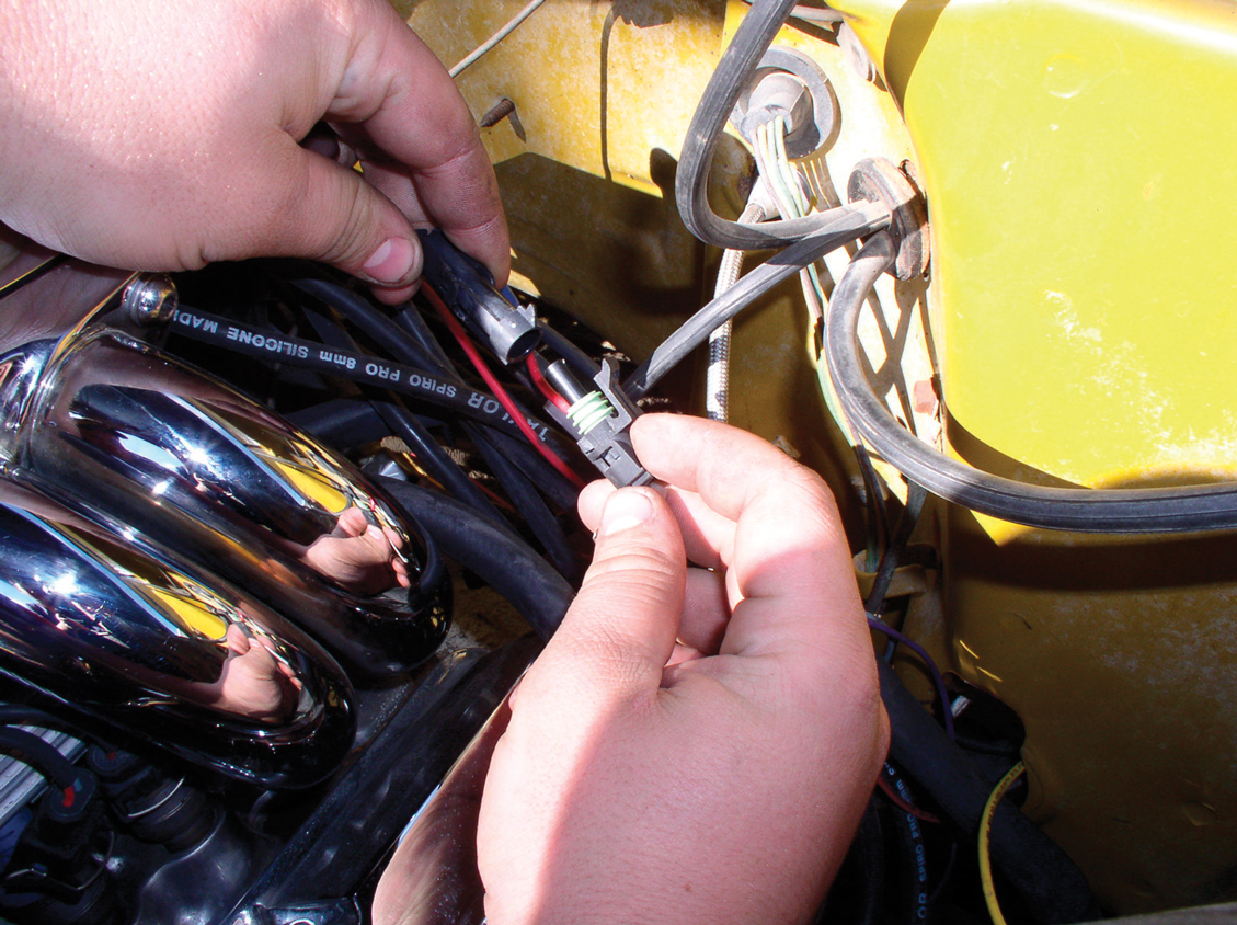 Hooking up the new S&P harness is a snap (no pun intended), since all the connections are labeled. S&P even goes so far as to color-coordinate them. In this case, since the truck is a pre-’74 model, the EGR lead is not used, so it is just taped out of the way.