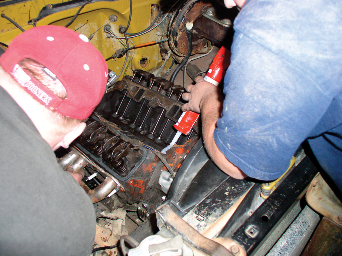 A bead of silicone gasket is applied to the end rails of the engine. In this shot you can see that the stock fuel pump has been removed and a block-off plate has been installed.