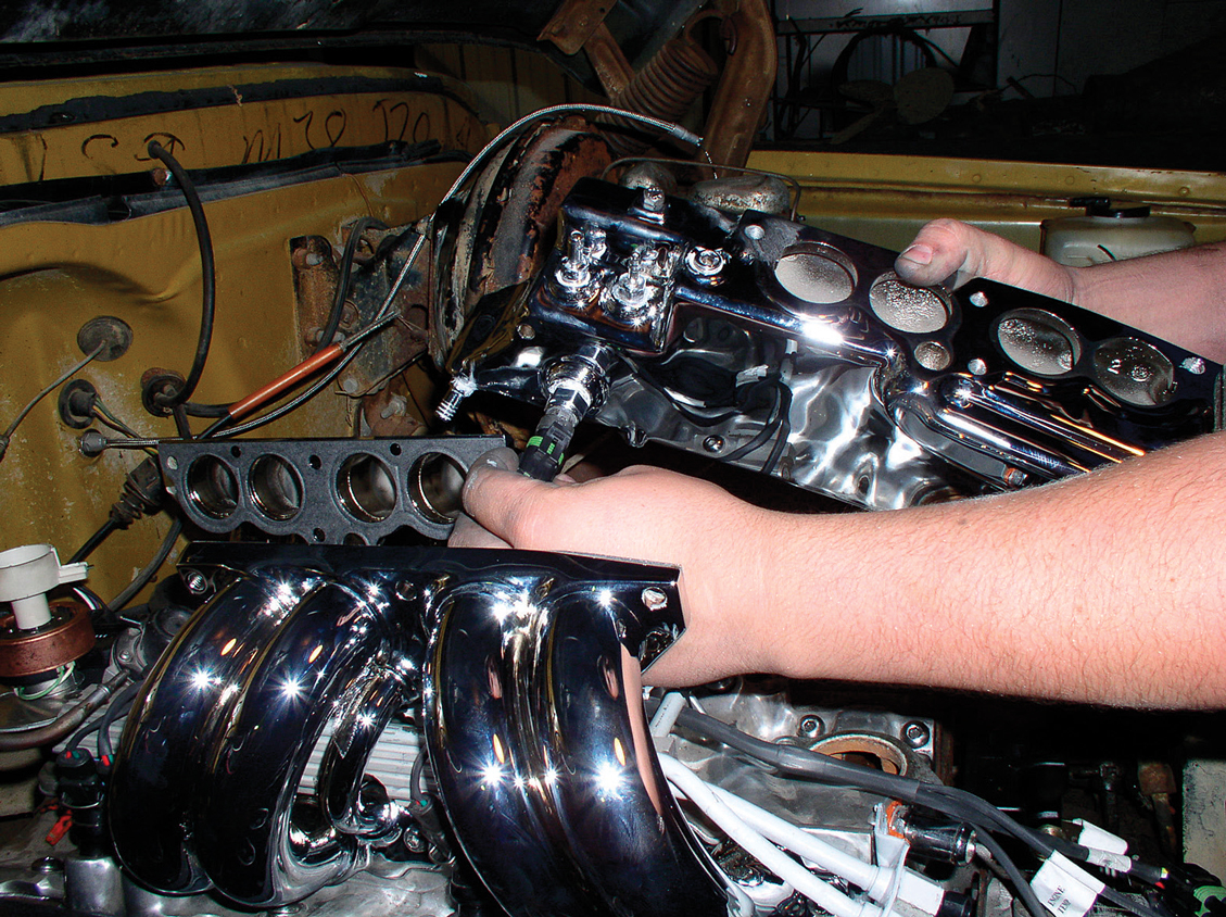 With the air-temp sensor installed into the bottom of the plenum (and the lead plugged into it), the plenum is set in place. Note that the plenum gaskets have been installed.