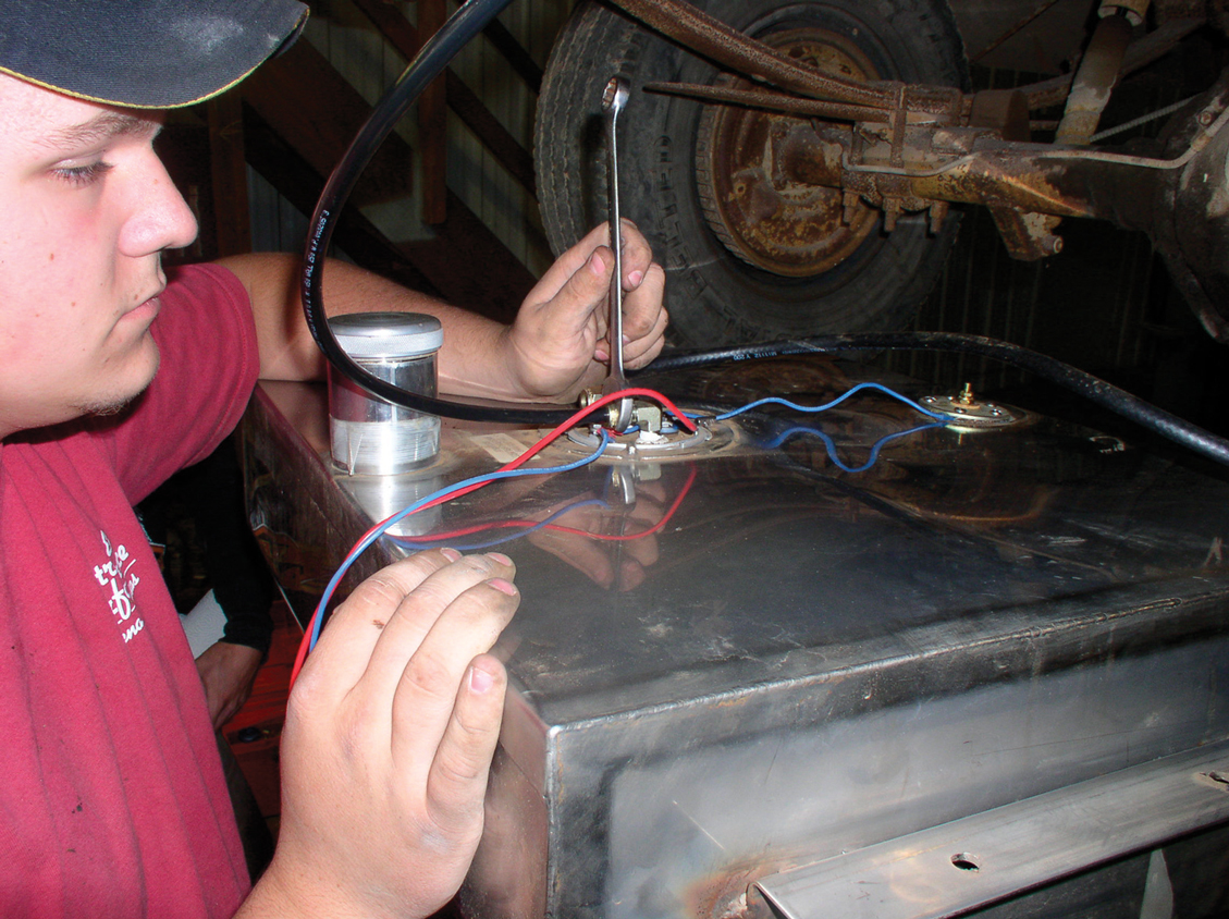 To demonstrate, this install will be handled by a mechanic who is only 17 years old. He is installing this kit onto his personal GMC pickup that he just received from his grandfather, and he has plans to drive it every day to school. He wanted to have an engine that was not subject to the whims of carburetors. One of the things that EFI requires, however, is that the fuel system be a closed-loop setup. It also needs to have a higher fuel pressure than what is normal for a carburetor. That means the stock fuel tank must be replaced with one that has a tank-mounted fuel pump that has provisions for a return line. A call to Rock Valley was all it took to get a new aluminum tank. The tank fits back between the framerails and even holds more fuel than the stock unit that was behind the seat.