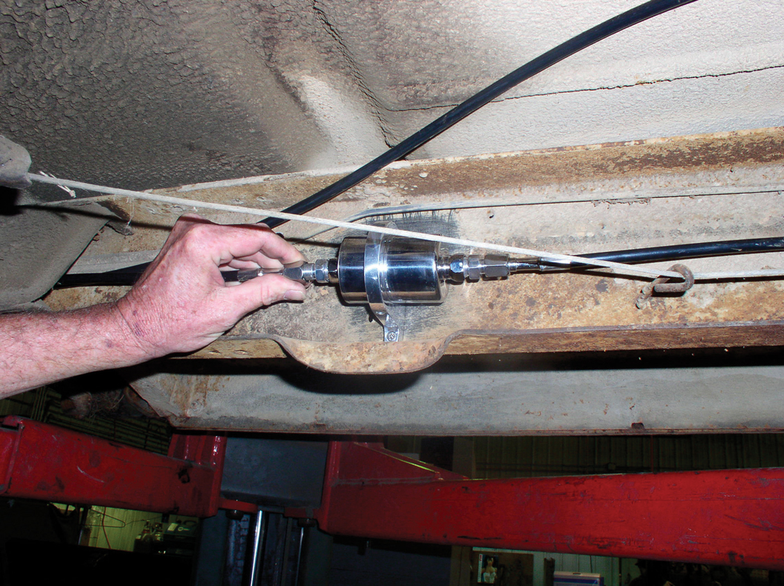 With the Rock Valley fuel tank in position, the fuel lines were hooked up. The S&P system requires that a 3/8-inch feed line and a 5/16-inch return line be used. In this case, a set of Tube Tech nylon lines was used.