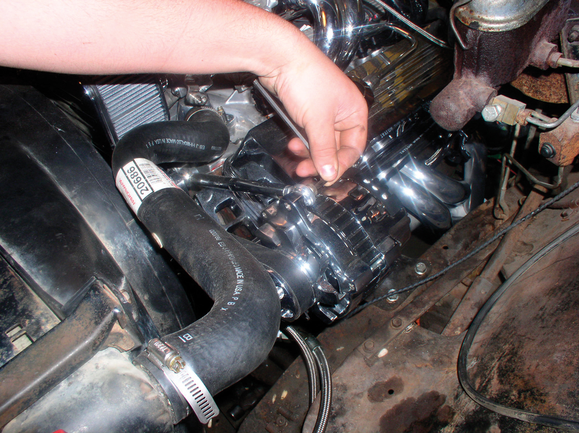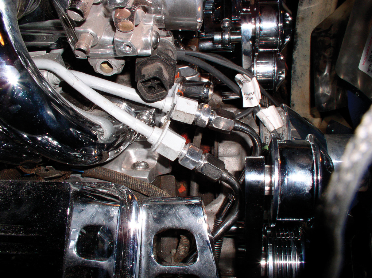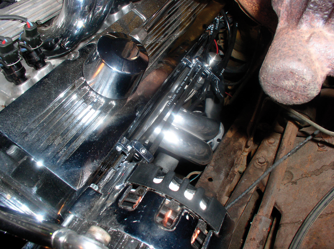 To give the engine a finished look, a set of S&P spark plug separators was used, along with a Lokar dipstick. Also note that the oxygen sensor has been installed onto the collector on the driver’s side.
