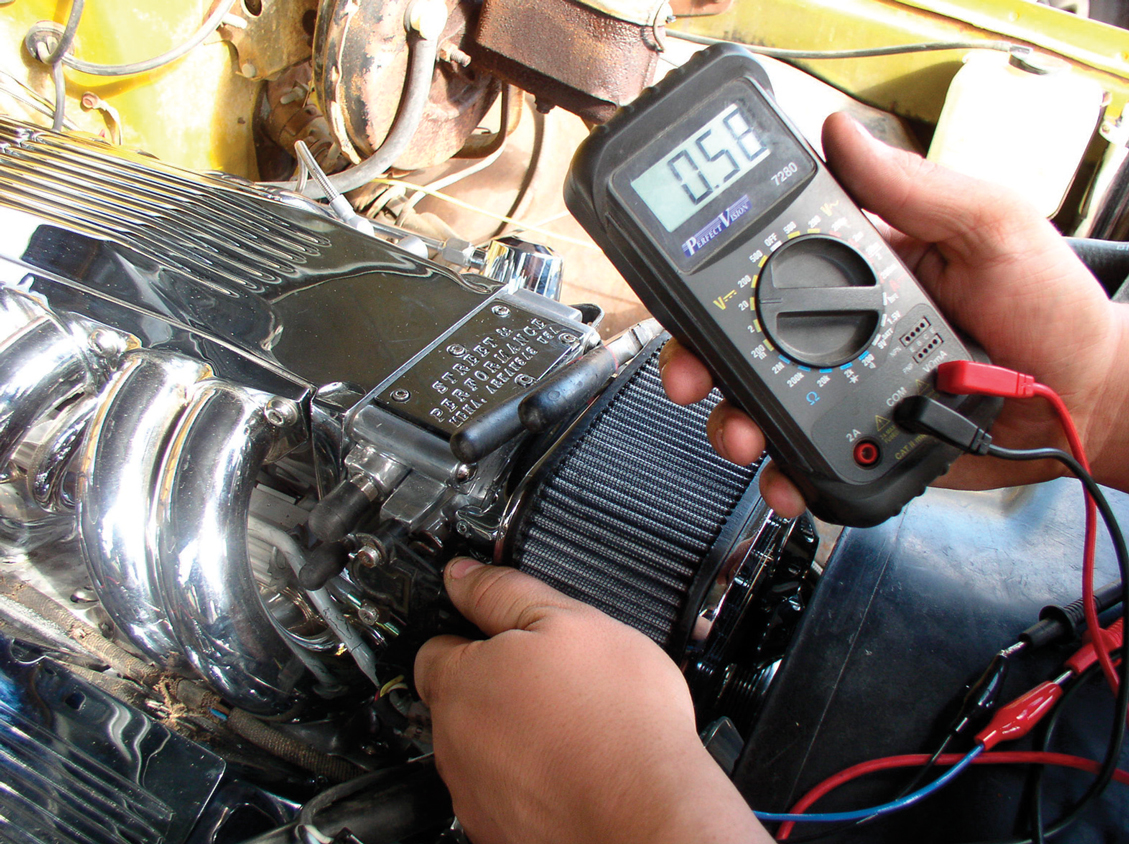 With the S&P throttle-position sensor pigtail hooked up, a digital voltmeter is connected to it. The TPS needs to be calibrated, so, with the meter connected, the TPS is rotated until the reading on the meter is 4.5-5.0 volts with the throttle in the wide-open position.