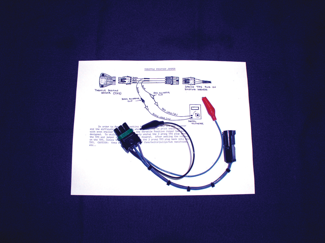 Adjusting the throttle-positioning sensor is a major step toward making your TPI work correctly. To do this easily, S&P has produced this pigtail harness. It plugs inline into the TPS sensor, and the leads are then easily hooked up to a digital voltmeter.