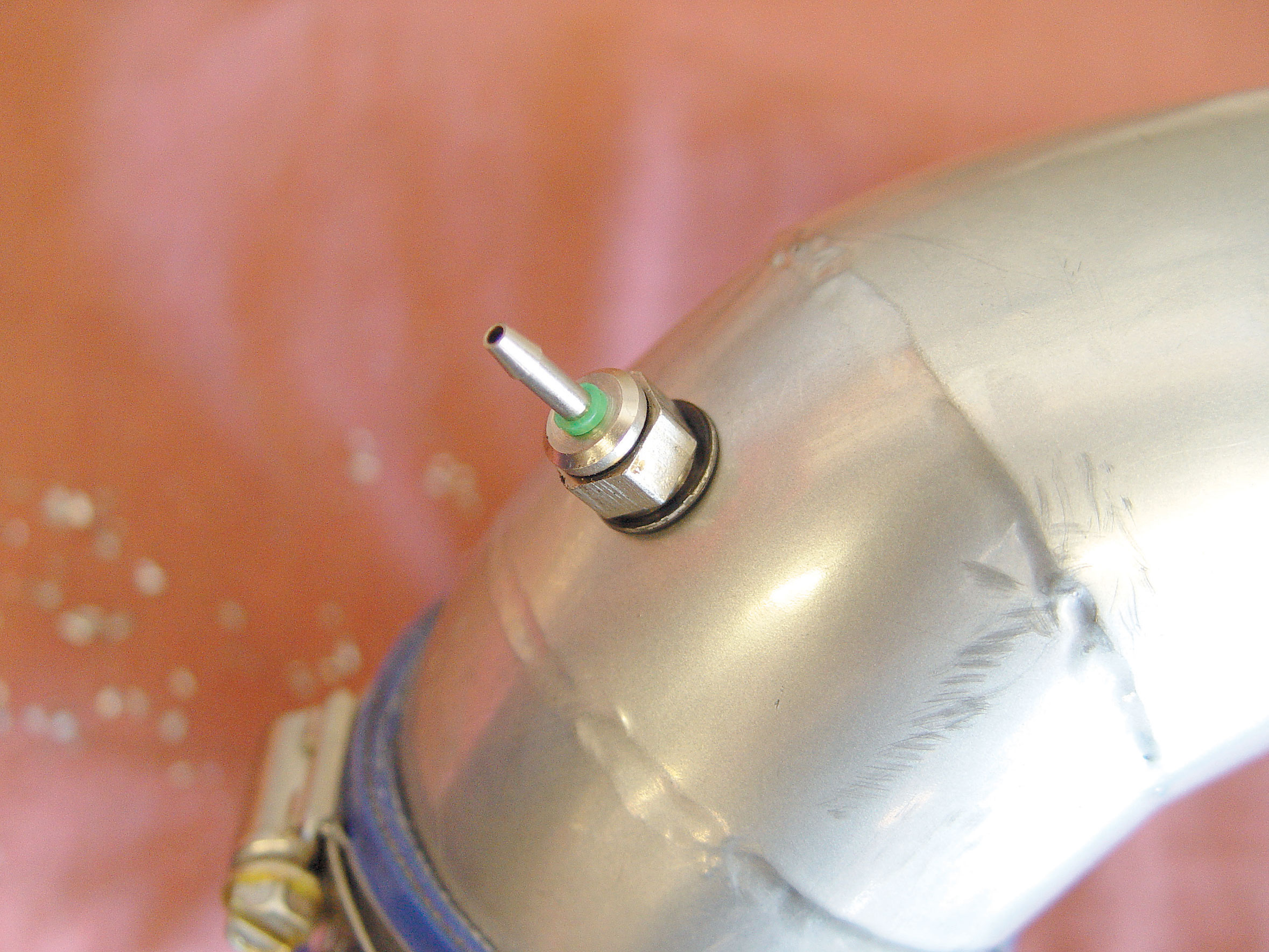 The upper intercooler pipe must be removed in order to install the Aquamist nozzle. This is achieved by loosening the hose clamps at the throttle body and intercooler.